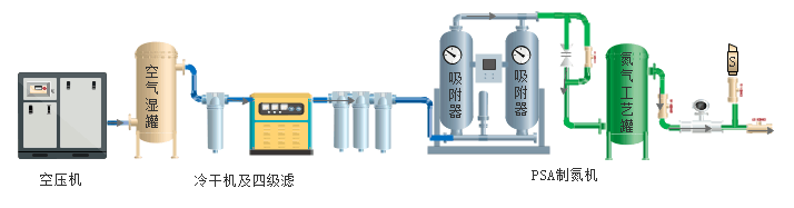 空壓機(jī)→空氣緩沖罐(濕罐)→C級(jí)過(guò)濾器→冷凍式干燥機(jī)→T級(jí)過(guò)濾器→A級(jí)過(guò)濾器→H級(jí)過(guò)濾器→制氮機(jī)主機(jī)→氮?dú)饬髁浚兌?,壓力檢測(cè)→氮?dú)鈨?chǔ)氣罐→使用點(diǎn)